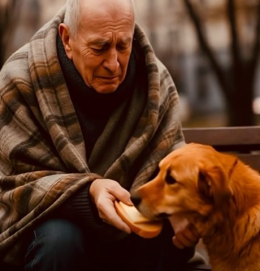 Hij stak de hond zijn boterham toe: « Hier, kleintje… Neem maar. Jij hebt het harder nodig. Het maakt mij niet meer uit… » Daarna ging hij langzaam op het bankje liggen, sloot zijn ogen, en de hond, die het brood met het ergste had opgegeten, moeite zich zwak tegen hem aan en piepte zwak. En toen…