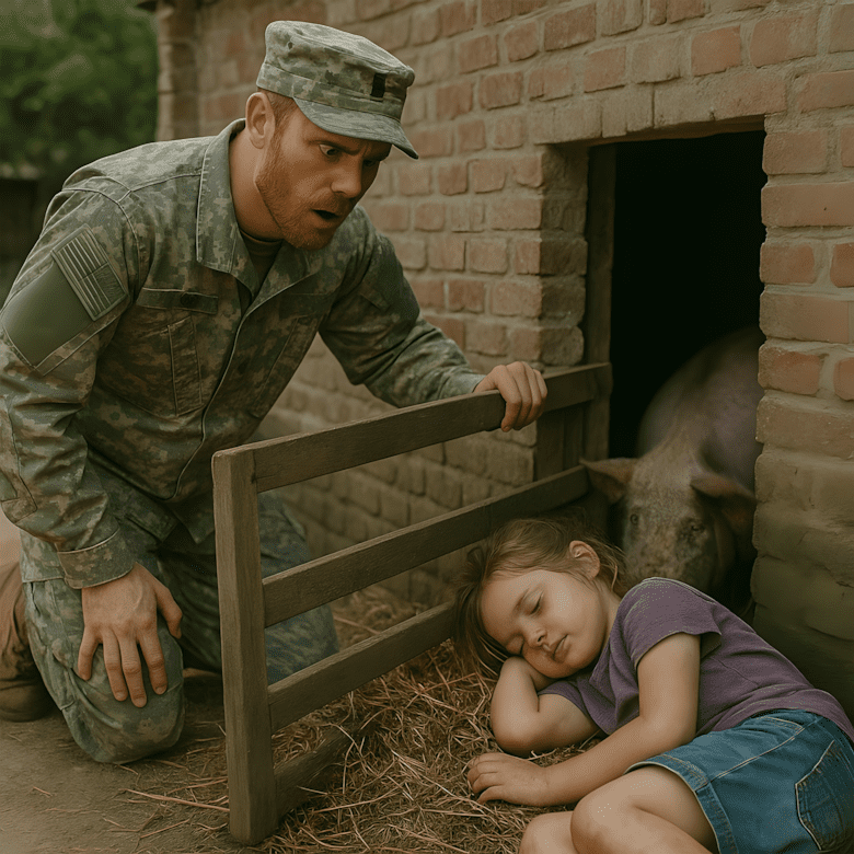 Zijn dochter, amper acht jaar oud, lag opgerold in een hoekje van de ren, haar kleine lichaam bedekt met aarde en stro. Tranen rolden over haar wangen terwijl er varkens in de buurt sjokten. Haar jurk was gescheurd, haar haar was klittend.