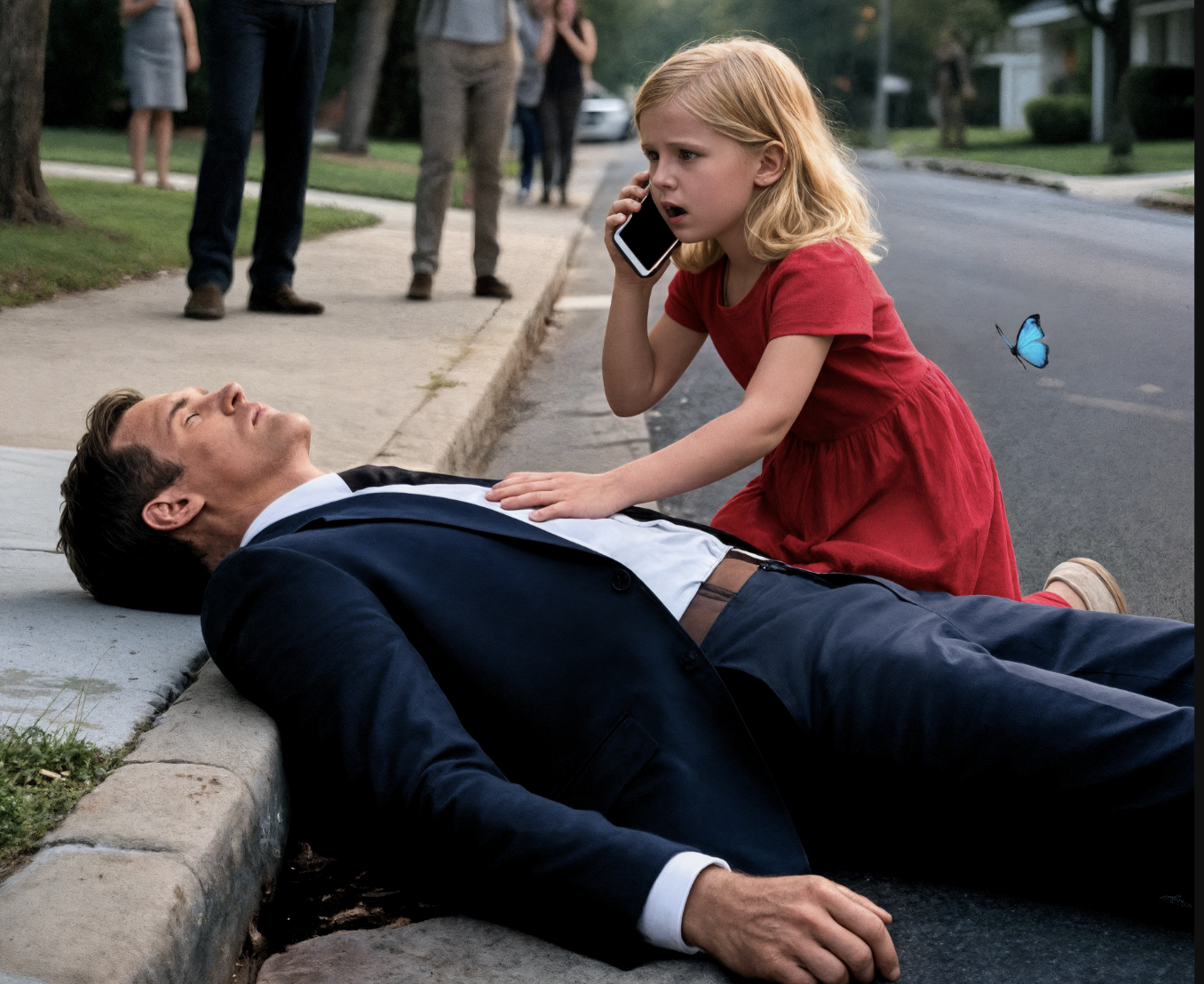 Ze verstijfde bij het geluid van een doffe klap en zag toen de man vallen. Zonder na te denken rende ze naar hem toe, legde haar kleine hand op zijn borst en fluisterde: « Hij ademt. »