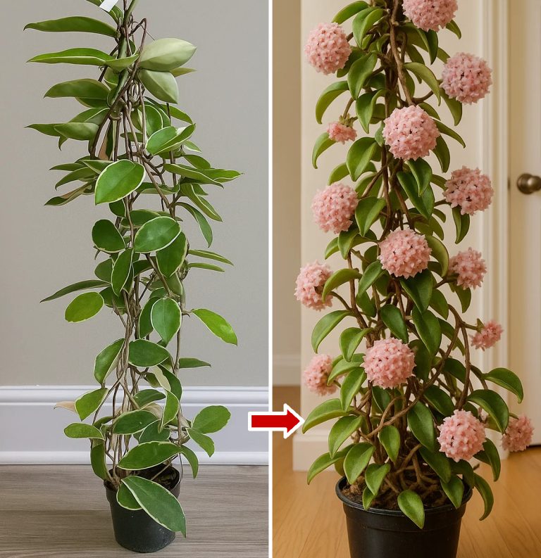 De wasbloem ( Hoya carnosa ) is een prachtige klimplant met dikke, wasachtige, vlezige bladeren die hem helpen water vast te houden. Het is een plant die sterk lijkt op vetplanten, die tot een meter hoog kan worden en oorspronkelijk uit China en Japan komt.