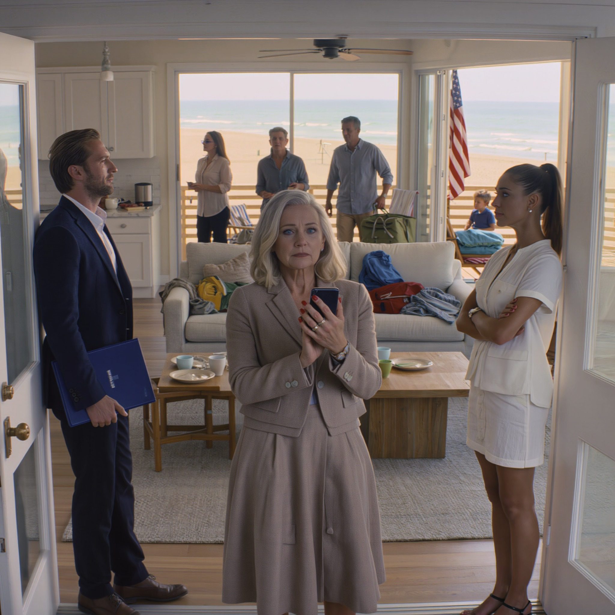 Ik ging met een makelaar naar mijn strandappartement om het klaar te maken voor de verhuur en trof daar mijn schoondochter, haar ouders en broers en zussen aan. Ze lachte en zei: « Je zoon heeft me de sleutels gegeven. Als je het niet bevalt, bel dan de politie! » Ik pakte mijn telefoon en belde. Toen ze zag wie er opnam, werd ze bleek en zweeg ze.