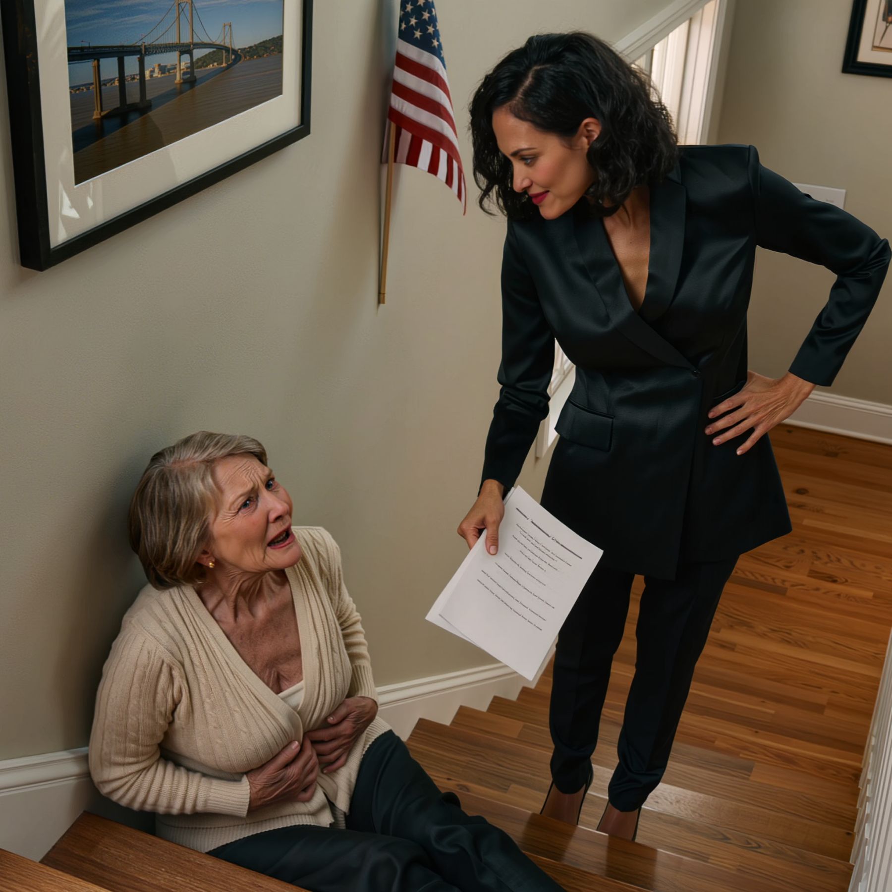 Ik heb mijn enige dochter opgevoed en verwend… tot de dag dat ze me van de trap liet vallen en zei: « Teken het testament, mam. Dit is nog maar het begin. » Een felle pijn schoot door mijn lichaam. Toen kwam er een vrouw binnen, en het gezicht van mijn dochter werd bleek en ze begon te trillen.