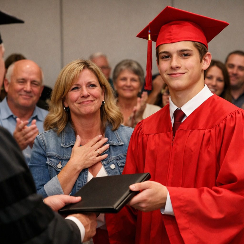 “Ik heb mijn zoon als tienermoeder alleen opgevoed. Tijdens zijn diploma-uitreiking liep hij in een rode jurk het podium op, verblufte de hele zaal, en wat er daarna gebeurde, bracht iedereen tot tranen.”