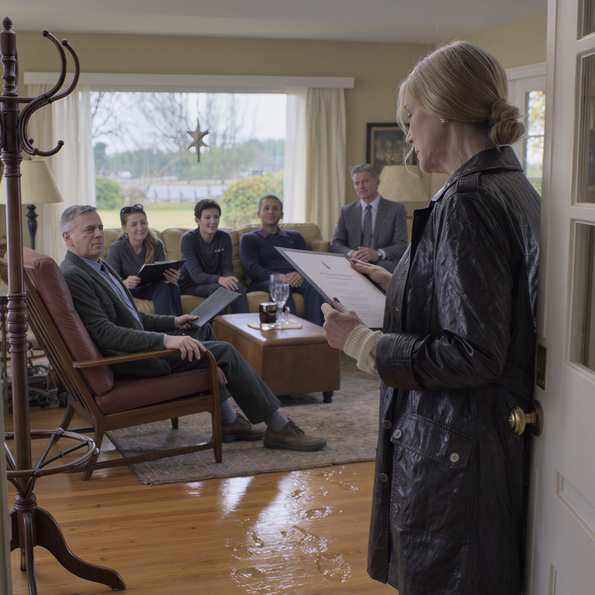 Ryan zat in Margarets favoriete stoel alsof hij er geboren was, zijn ene enkel rustend op zijn knie, zijn handen gevouwen, zo kalm als een man die op een pizza wacht. Hij had er geen enkele keer in gezeten in de tien jaar dat ik Margarets kussens omdraaide, haar medicijnen afmat en haar door nog een lepeltje, nog een uur heen loodste. Mijn zoon Daniel zat op de bank, met zijn schouders naar beneden, zijn ogen gefixeerd op zijn handen alsof die de enige waarheid in de kamer vertegenwoordigden. Chloe zat naast hem met een map op haar schoot, haar grote zonnebril nog steeds op ondanks het schemerige licht, regendruppels parelden op het montuur alsof ze het als een pantser droeg. Bij het raam zat een magere man in een grijs pak in de fauteuil, zijn aktetas even netjes op het tapijt geparkeerd als een vonnis.