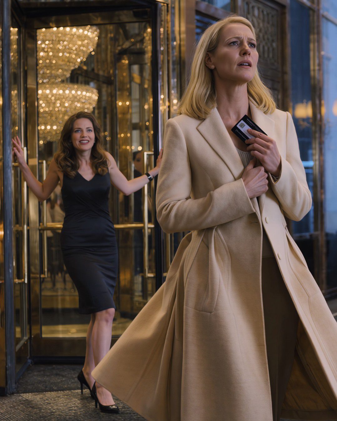 Ik zag een auto achter me stoppen op de ronde oprit, de koplampen wierpen een wit licht over de marmeren trappen. De parkeerwachter snelde naar voren, in keurig uniform, met een rechte houding. Hij zag me, en heel even flitste er een blik van herkenning op zijn gezicht. Zijn blik viel op de sleutelkaart in mijn hand, en vervolgens op mijn gezicht.