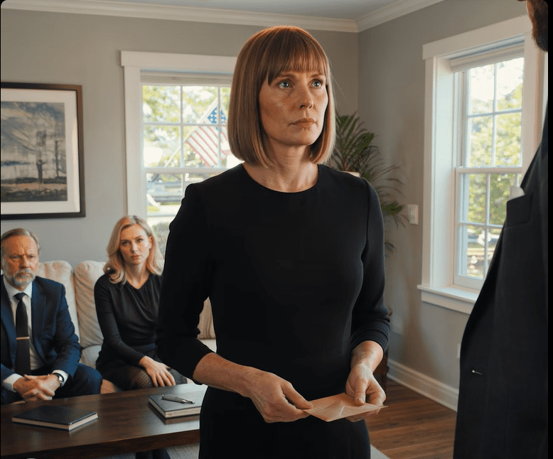 Ryan, mijn man, zat met zijn benen over elkaar op de bank alsof hij de eigenaar van het huis was. Lisa zat naast hem, haar handtas op haar schoot, rechtop en alert – bijna tevreden. Tegenover hen, in de fauteuil bij het raam waar Margaret vroeger met haar thee zat, zat een man die ik nog nooit eerder had gezien. Hij droeg een grijs pak dat er te formeel uitzag voor een huis dat nog steeds vaag naar ontsmettingsdoekjes en Margarets lavendelzeep rook.