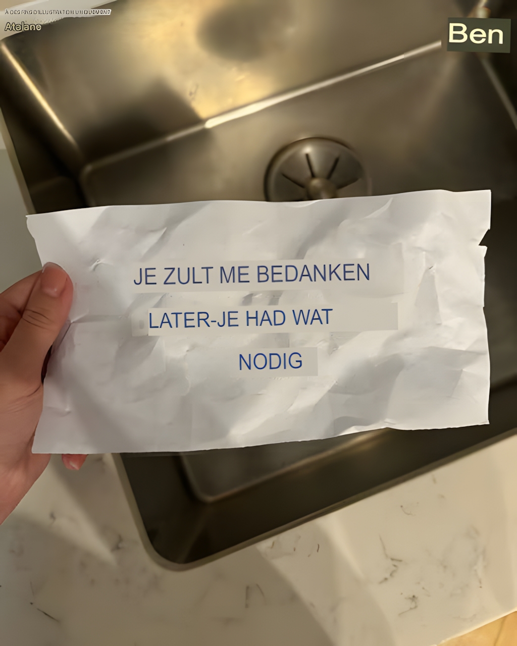 Terwijl ik op zijn antwoord wachtte, zag ik een klein stukje papier tussen het koffiezetapparaat en de suikerpot zitten. Het leek alsof het uit haat was gedaan, bijna als een bijzaak. Het was een eenvoudig gekreukt vel papier met een tekst die ik niet herkende.