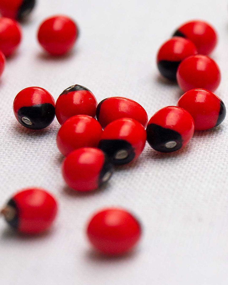 Tijdens mijn onderzoek ontdekte ik dat deze zaden nauw overeenkwamen met de beschrijving van rozenkranserwten, wetenschappelijk bekend als Abrus precatorius. Deze zaden staan bekend om hun levendige rode kleur met een opvallende zwarte vlek. Hoewel ze misschien onschadelijk lijken, bevatten rozenkranserwten een krachtige toxine genaamd abrine, die extreem gevaarlijk kan zijn bij inname.