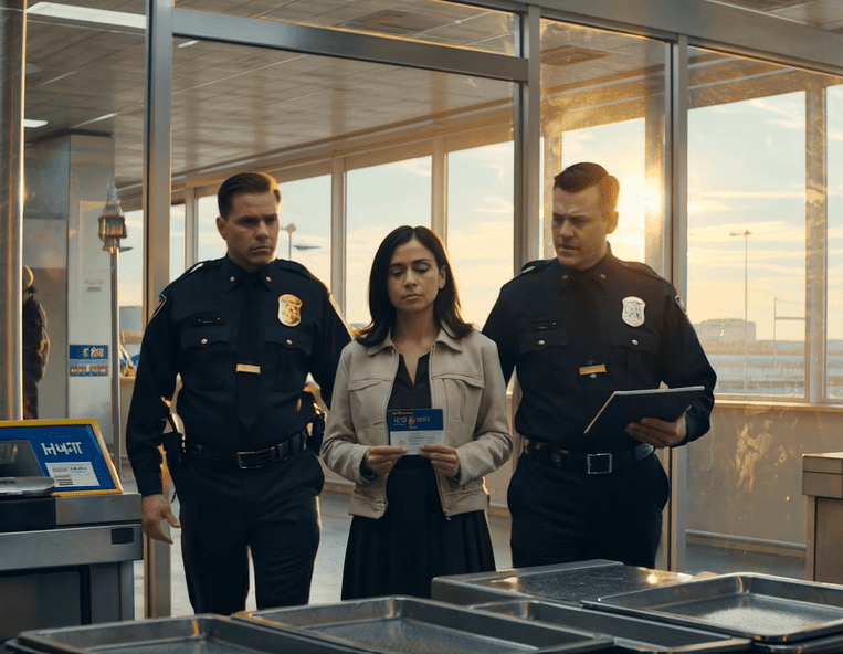 Het dienblad schoof naar voren en ik liep richting de metaaldetector, precies op het moment dat een luchthavenmedewerker mijn pad kruiste. Geen TSA-medewerker, geen supervisor in een blauw shirt – maar een luchthavenagent in een donker uniform met een kalm gezicht dat niet paste bij een normale reisdag.
