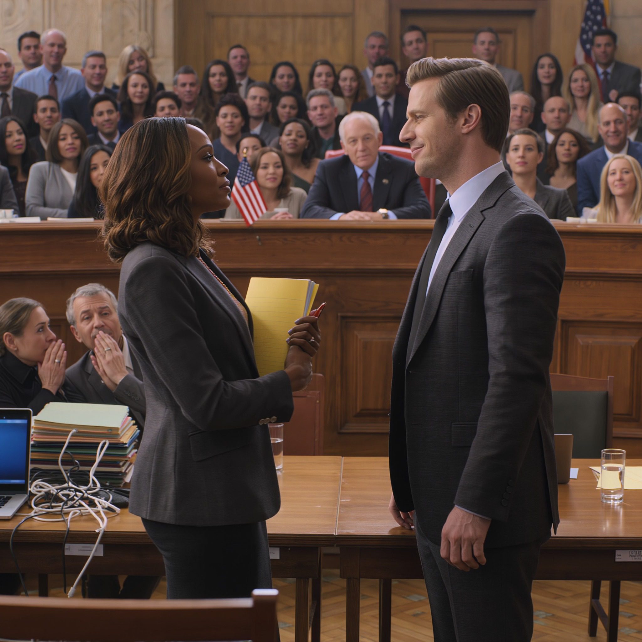 Jameson Brooks leunde achterover in zijn Italiaanse leren fauteuil en streek de revers van zijn antracietkleurige pak van 3000 dollar glad. Hij draaide zich om naar zijn advocaat, Harrison Howard – een man die in juridische kringen bekend stond als de Slager, omdat hij niets onbeantwoord liet – en fluisterde zo hard dat de halve zaal het kon horen.