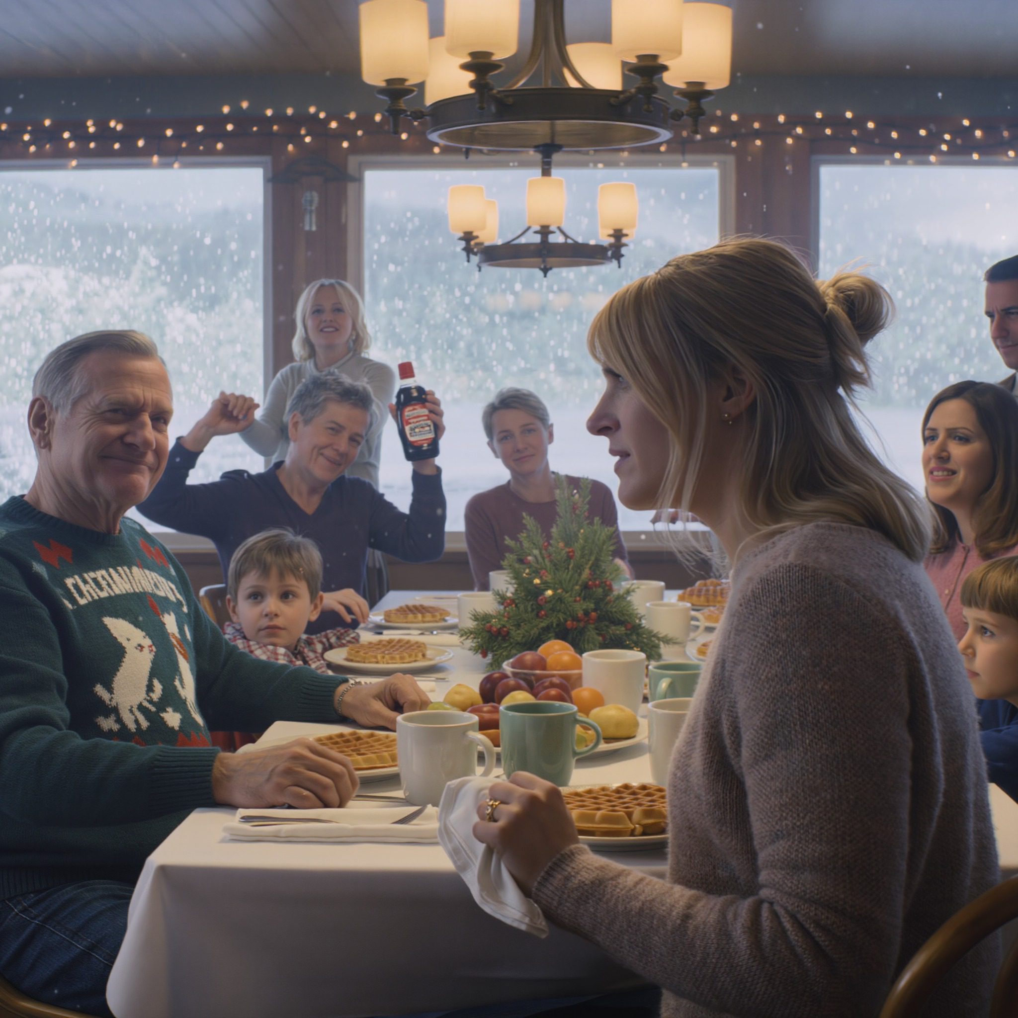 Ik kwam aan bij de kerstbrunch met mijn kinderen, die de sneeuw van hun jassen schudden en kleine plasjes achterlieten op de zwart-witte tegels. Een luidspreker in de hoek speelde een oud kerstliedje van Sinatra, en er hing een gelamineerde afdruk van de Amerikaanse vlag scheef opgeplakt bij de gastvrouwbalie, vlak boven een rek met beschadigde koffiemokken. Op de tafel die voor mijn gezin was gereserveerd, stond een klein glazen potje met nep-veenbessen en dennentakjes, met een klein papieren vlaggetje als tandenstoker in het midden, alsof iemand te hard zijn best had gedaan om het feestelijk te maken.