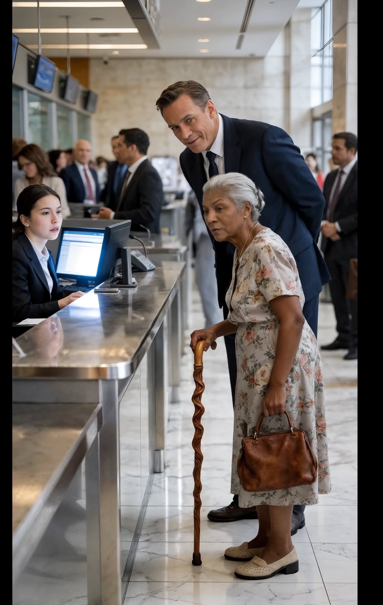 De rij bij de balies was lang, maar Evelyn wachtte geduldig. Vlak achter haar stond Richard Harrington, een vijftiger en miljonair in de vastgoedsector, bekend om zijn luxe auto’s, designpakken en uitbundige persoonlijkheid. Hij keek geïrriteerd op zijn Rolex en mopperde over de trage service.