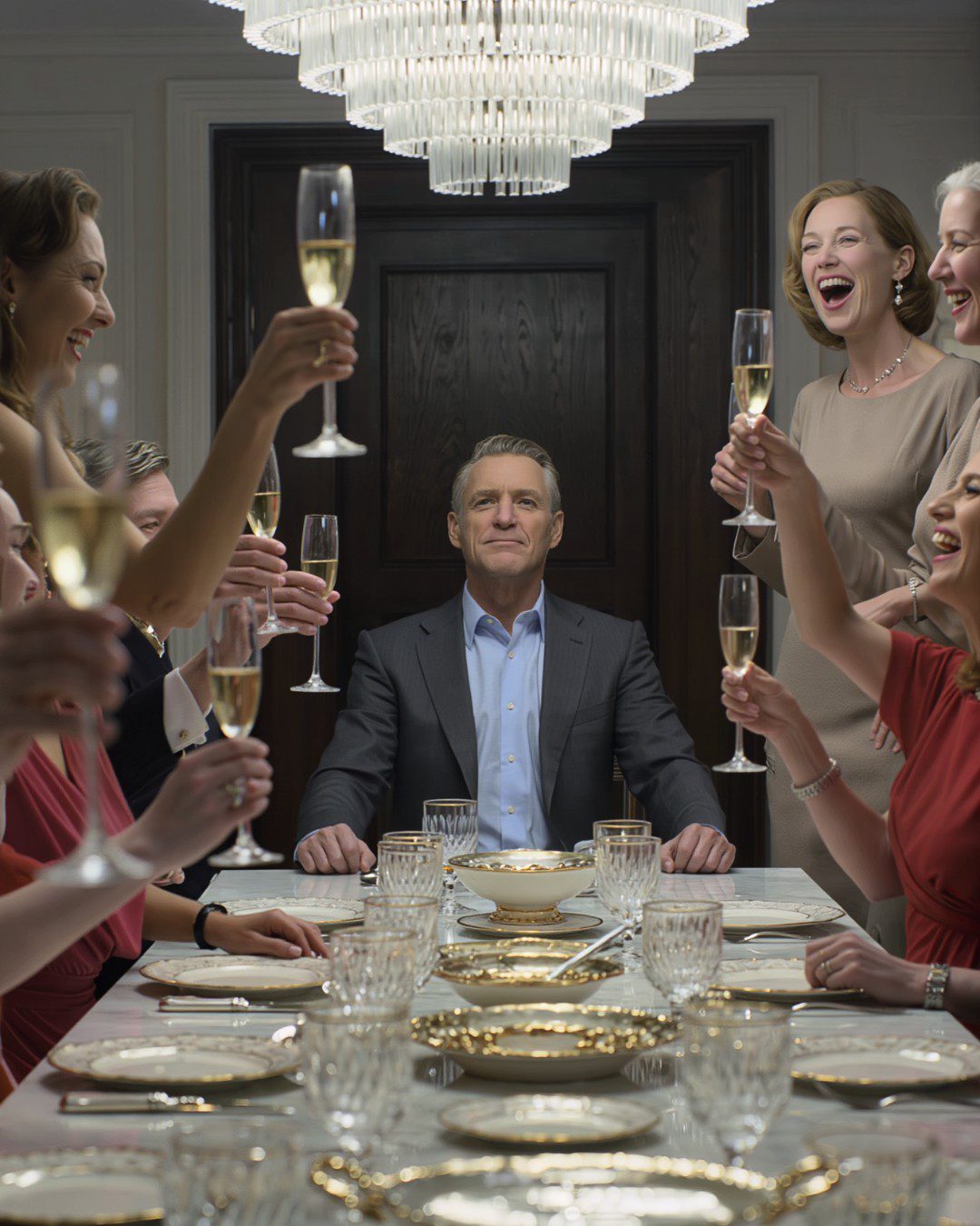 Hij zat daar alsof de stoel speciaal voor hem was gemaakt, alsof het hoofd van de tafel niet zomaar een meubelstuk was, maar een troon die hij had verdiend door puur zelfvertrouwen. Zijn pak zat perfect, donker en strak, van een stof die zachtjes bewoog. Elke keer dat hij zijn rechterhand ophief, flitste zijn horloge onder de kroonluchter en ving het licht op alsof het ook aandacht opeiste.