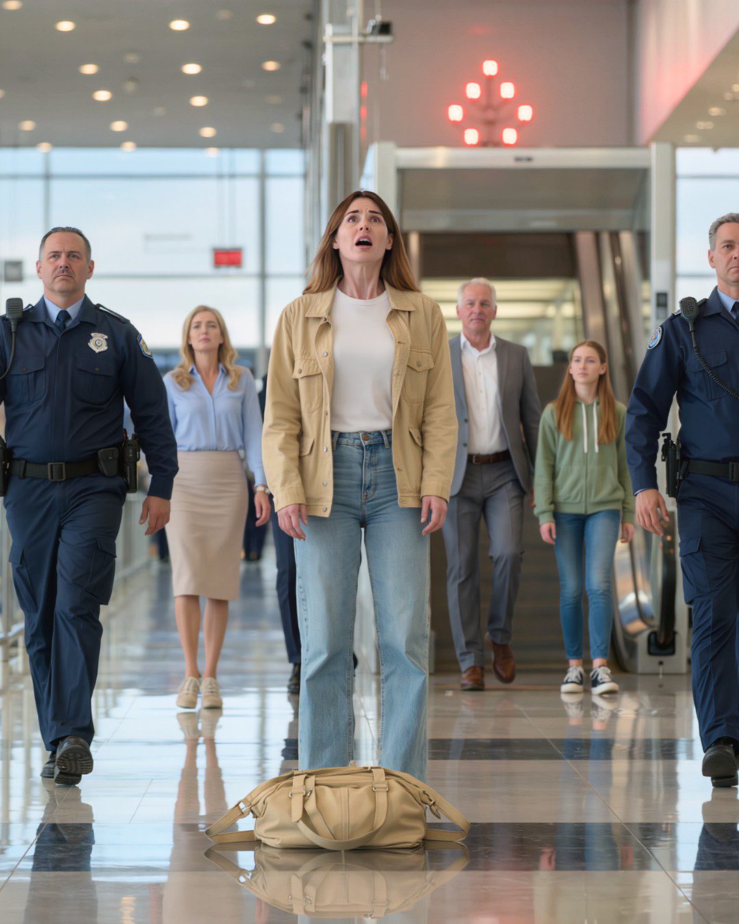 De veiligheidsscanner net voorbij de gate – eentje die ik niet eens had opgemerkt – barstte los in een schel, heftig alarm. Rode lampjes flitsten. Twee geüniformeerde luchthavenagenten draaiden zich abrupt om, hun handen al naar hun holsters grijpend.