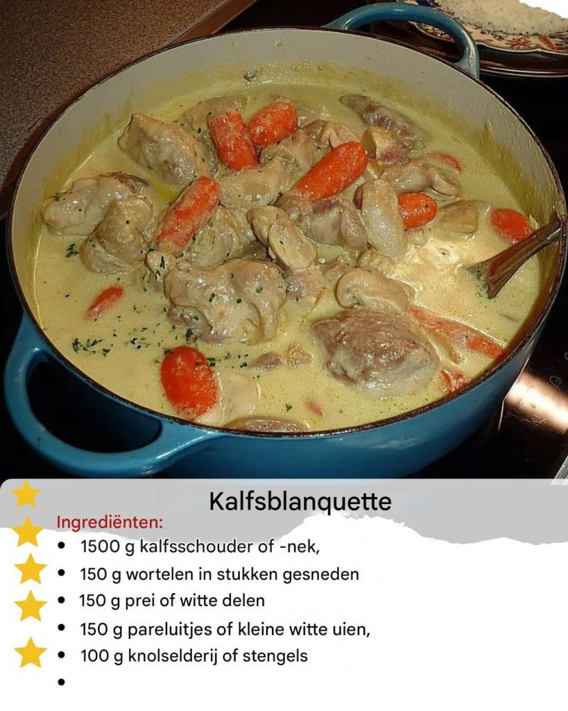 Kalfsblanquette is een van de pareltjes van de Franse gastronomie. Dit iconische gerecht, mals, delicaat en romig, belichaamt de traditionele en troostende keuken. Bereid met stukjes kalfsvlees, langzaam gegaard in een geurige bouillon en vervolgens bedekt met een gladde witte saus, is blanquette een symbool van elegantie en eenvoud. Geserveerd met rijst of groenten combineert het alle kwaliteiten van een verfijnd en troostend gerecht.