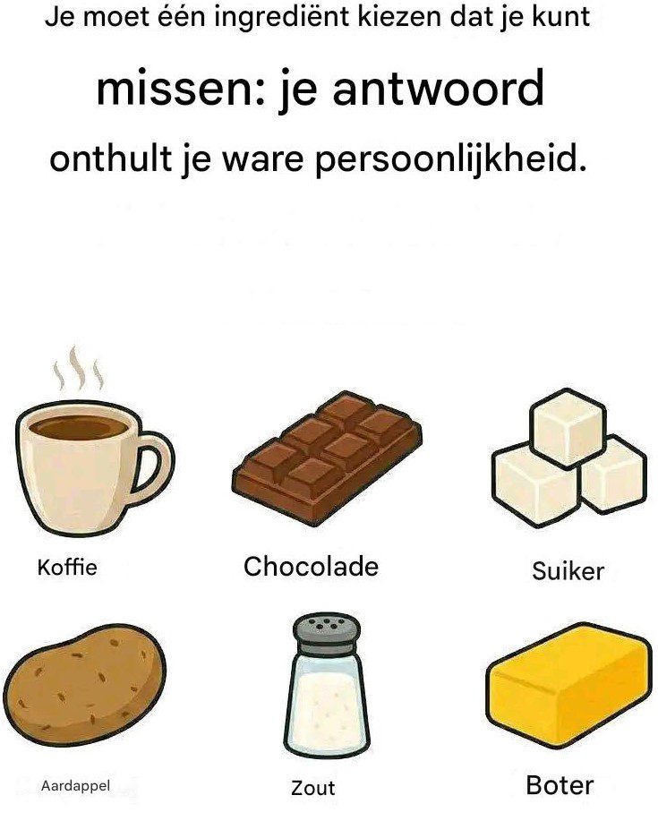 Kies één ingrediënt dat je eigenlijk niet nodig hebt: je antwoord onthult je ware persoonlijkheid.