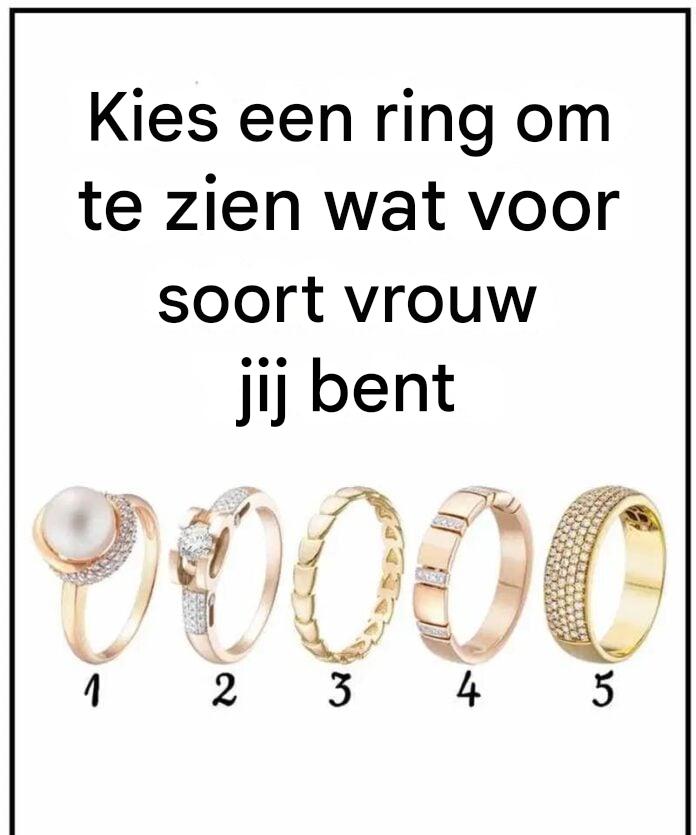 Vandaag nodig ik je uit om iets simpels maar onthullends te proberen. Kijk naar de vijf ringen die hieronder worden beschreven. Denk er niet te veel over na. Let gewoon op welke ring je aanspreekt. De ring die je kiest, kan iets betekenisvols onthullen over het type vrouw dat je bent.