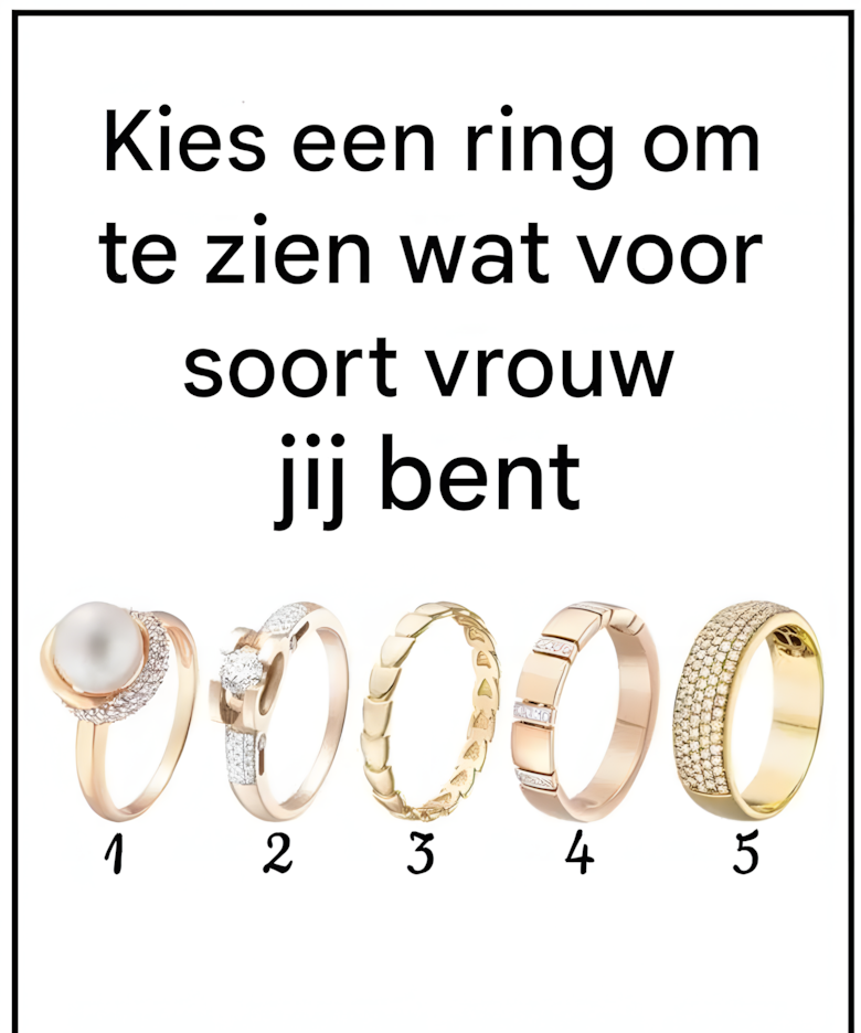 Kijk naar de vijf ringen op de afbeelding hierboven en kies de ring die je direct aanspreekt. Denk er niet te lang over na en kies gewoon de ring die het beste bij je past. Lees na je keuze de onderstaande beschrijving om te ontdekken wat je keuze zegt over het type vrouw dat je bent.