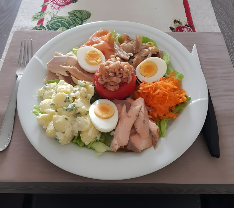 1 tomaat (uitgehold en gevuld met grijze garnalen)
