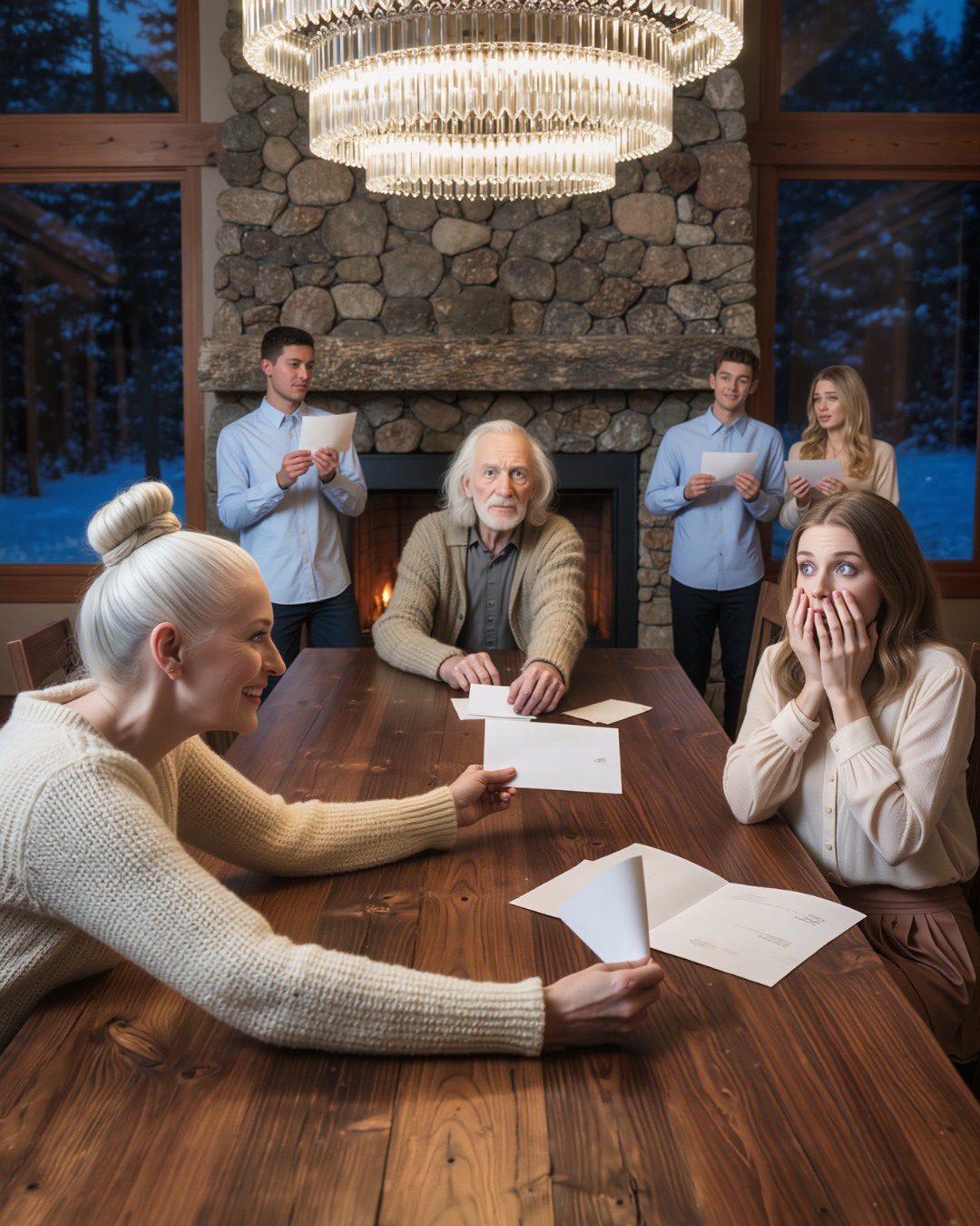 De kroonluchter boven ons verspreidde licht over kristallen glazen en gepolijst zilver. Buiten lag de sneeuw als een deken over de dennenbomen, alsof iemand suiker over de hele wereld had gestrooid. Het vuur achter me knetterde en pruttelde, waardoor de lucht gevuld werd met de kostbare, zorgvuldig uitgekozen geur van dennenhout en geld.