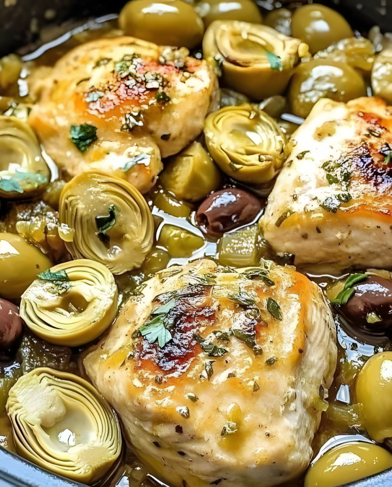 Mediterrane kip met citroen, artisjokken en olijven