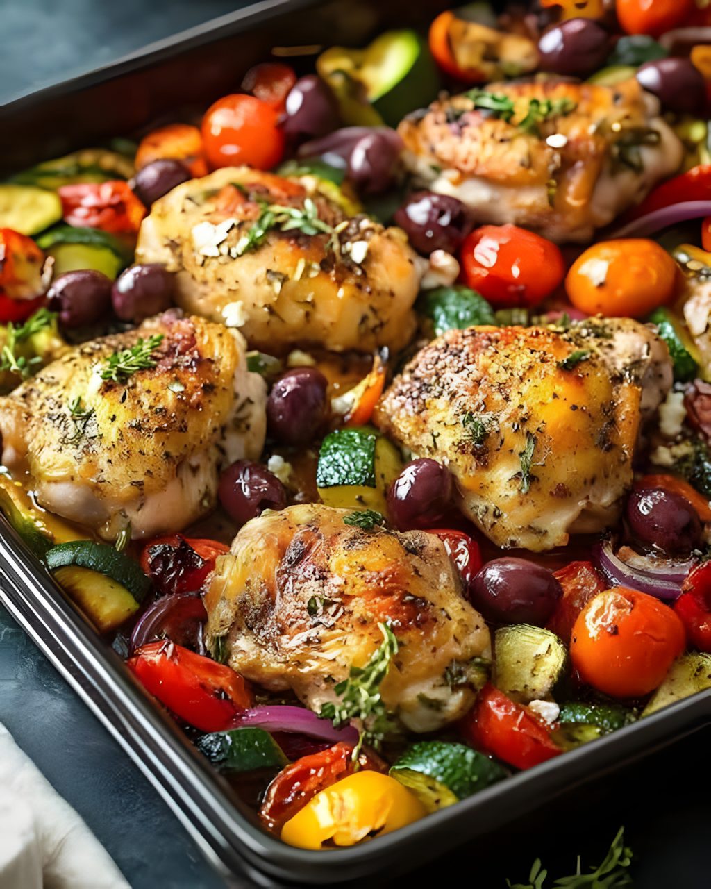 Knapperige kippendijen, omringd door kleurrijke groenten, kruidige olijven en hartige artisjokharten, gebakken in een geurige mix van oregano, knoflook en citroen. Dit gerecht brengt je zo naar de zonnige kust van de Middellandse Zee! 🌊☀️