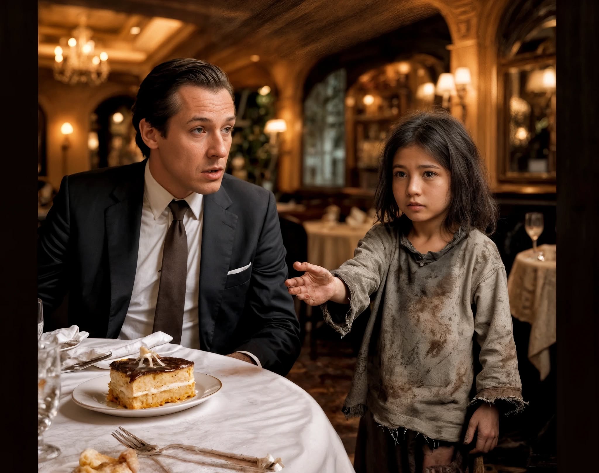 « Meneer, u heeft iets in uw taart gedaan! » zei het kleine bedelmeisje tegen de miljonair…