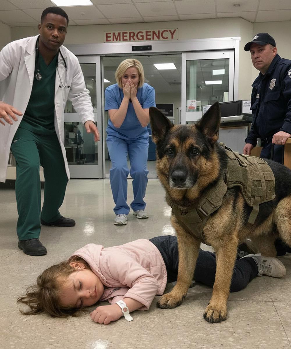 Ze kon niet ouder dan zes jaar zijn geweest. Haar kop hing in een onnatuurlijke hoek terwijl de hond haar stap voor stap naar voren sleepte, zonder haar los te laten tot hij het midden van de wachtkamer bereikte. Pas toen liet hij haar los – en positioneerde zich onmiddellijk boven haar kleine lijfje, als een levend schild dat de wacht hield.