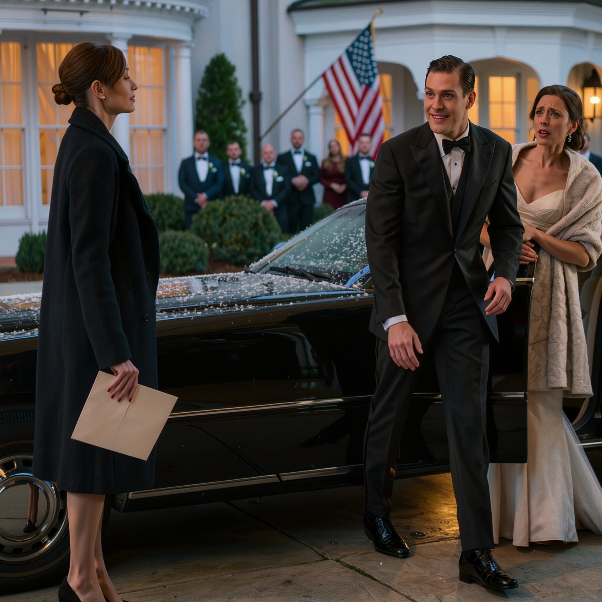 Een andere auto stopte bij de valetparking. Een vrouw in een zilveren jurk stapte uit, lachend om iets wat haar man haar had toegefluisterd. Ze haakten hun armen in elkaar en verdwenen door de ingang, omhuld door warmte en licht, terwijl ik alleen in de kou bleef staan.