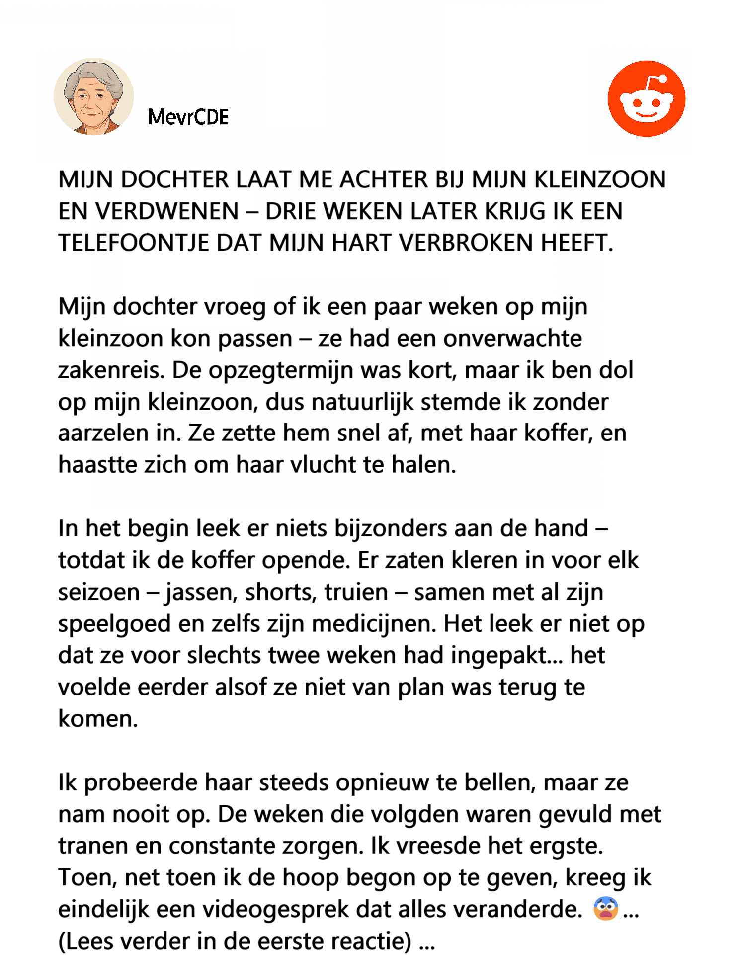 Ik had die dag geen bezoek verwacht, dus toen ik de deurbel hoorde, vroeg ik me af wie het zou zijn. Tot mijn verbazing zag ik mijn dochter Jane en mijn kleinzoon Tommy.