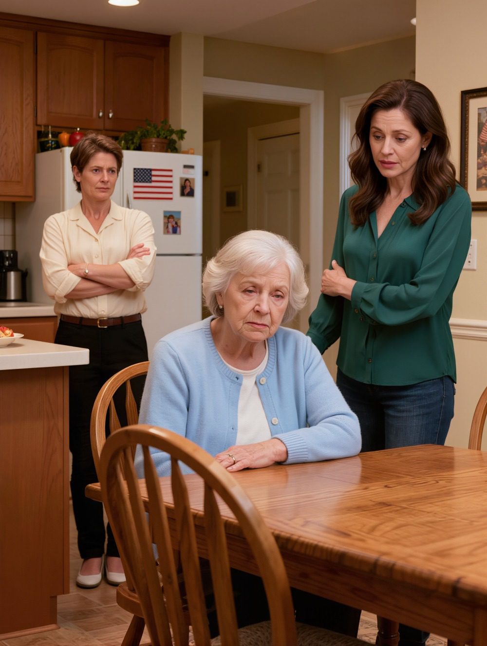 Toen mijn dochter Emma binnenstormde, het licht aanzette en geschrokken uitriep: « Mam, waarom zit je in het donker? En waarom is er geen eten in de keuken? Je krijgt elke maand tienduizend dollar, waar gaat dat allemaal naartoe? », wilde ik mijn mond openen, maar voordat ik kon antwoorden, stapte mijn schoondochter Rachel achter haar vandaan met een langzame, beheerste glimlach en zei: « Ik bepaal elke dollar die ze krijgt. »