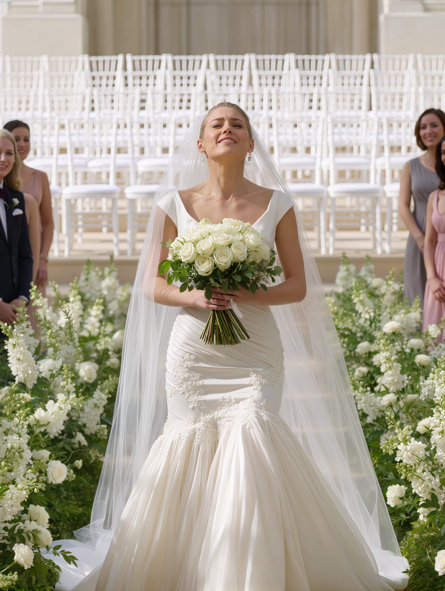 De late zon van Michigan scheen door de glas-in-loodramen en wierp gebroken kleurstrepen over de gepolijste kerkbanken en witte stoelhoezen. Lelies stonden in hoge glazen vazen langs het gangpad, hun zoete en zware geur kringelde door de lucht als een zegen. Het strijkkwartet in de hoek speelde zachte, klassieke muziek, het soort muziek dat mensen kiezen voor sprookjesachtige bruiloften die ze zich decennia later nog zouden herinneren.