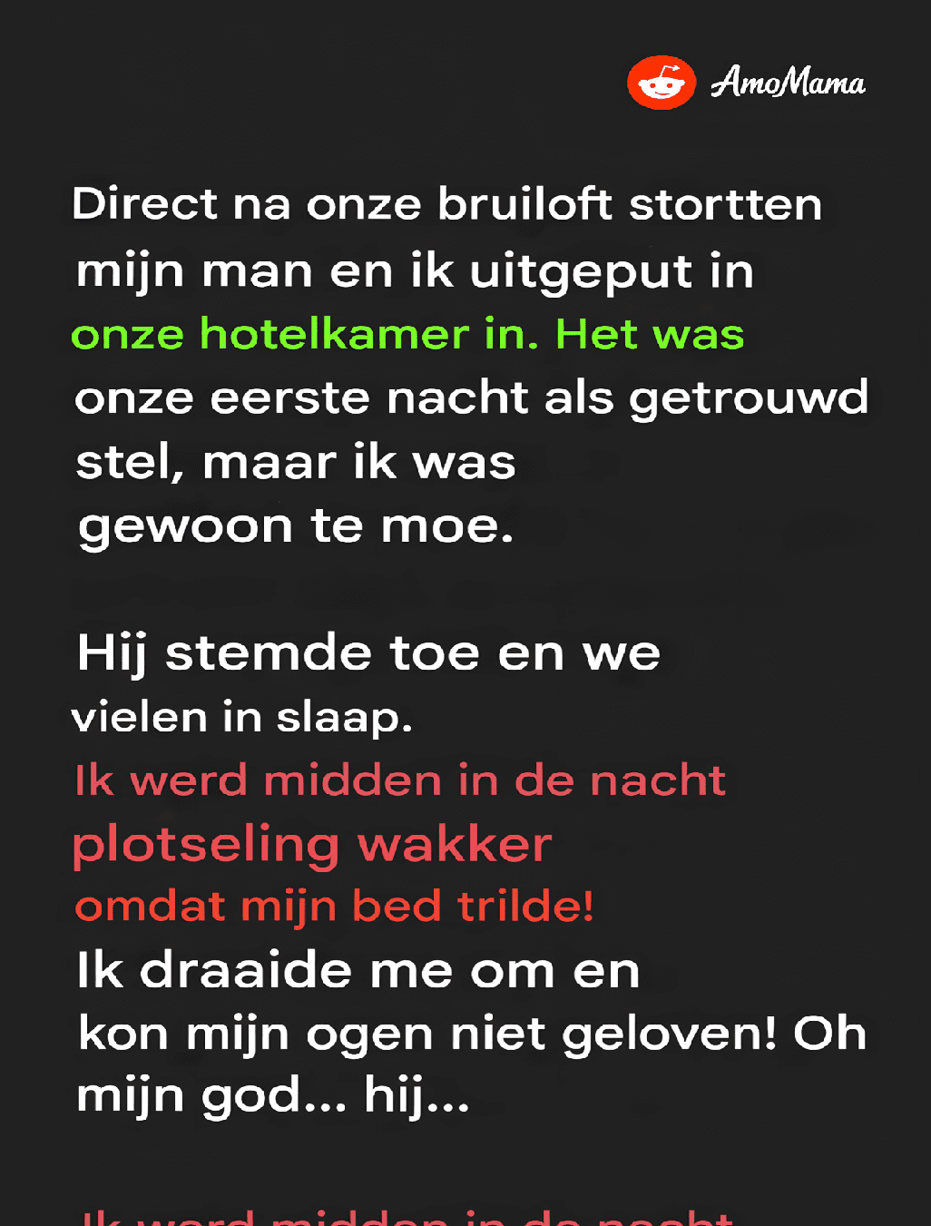 Op onze huwelijksnacht wilde mijn man, Scott, passioneel met me zijn, maar ik weigerde omdat ik moe was. Hij stemde toe en kuste me welterusten. Plotseling, om middernacht, voelde ik het bed schudden en draaide ik me om, maar ik verstijfde terwijl ik Scott zag doen wat hij deed.