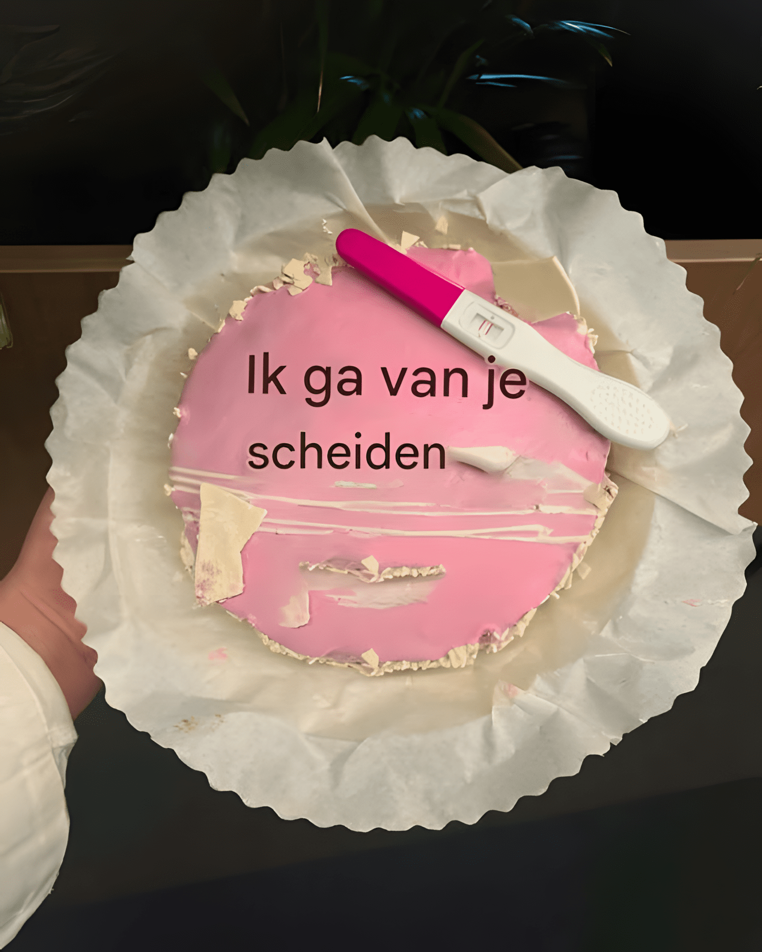 Bovenop de taart lag een positieve zwangerschapstest.