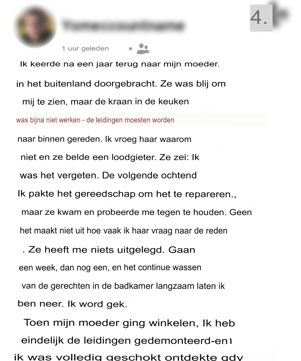 Ze wilde me niet in de ogen kijken. « Oh, zie je. » « Een paar weken. » “Een paar weken?” Ik knielde neer en keek naar het kastje onder de gootsteen. De leidingen lijken onaangetast te zijn sinds de regering van Carter. « Waarom heb je niemand gebeld? »
