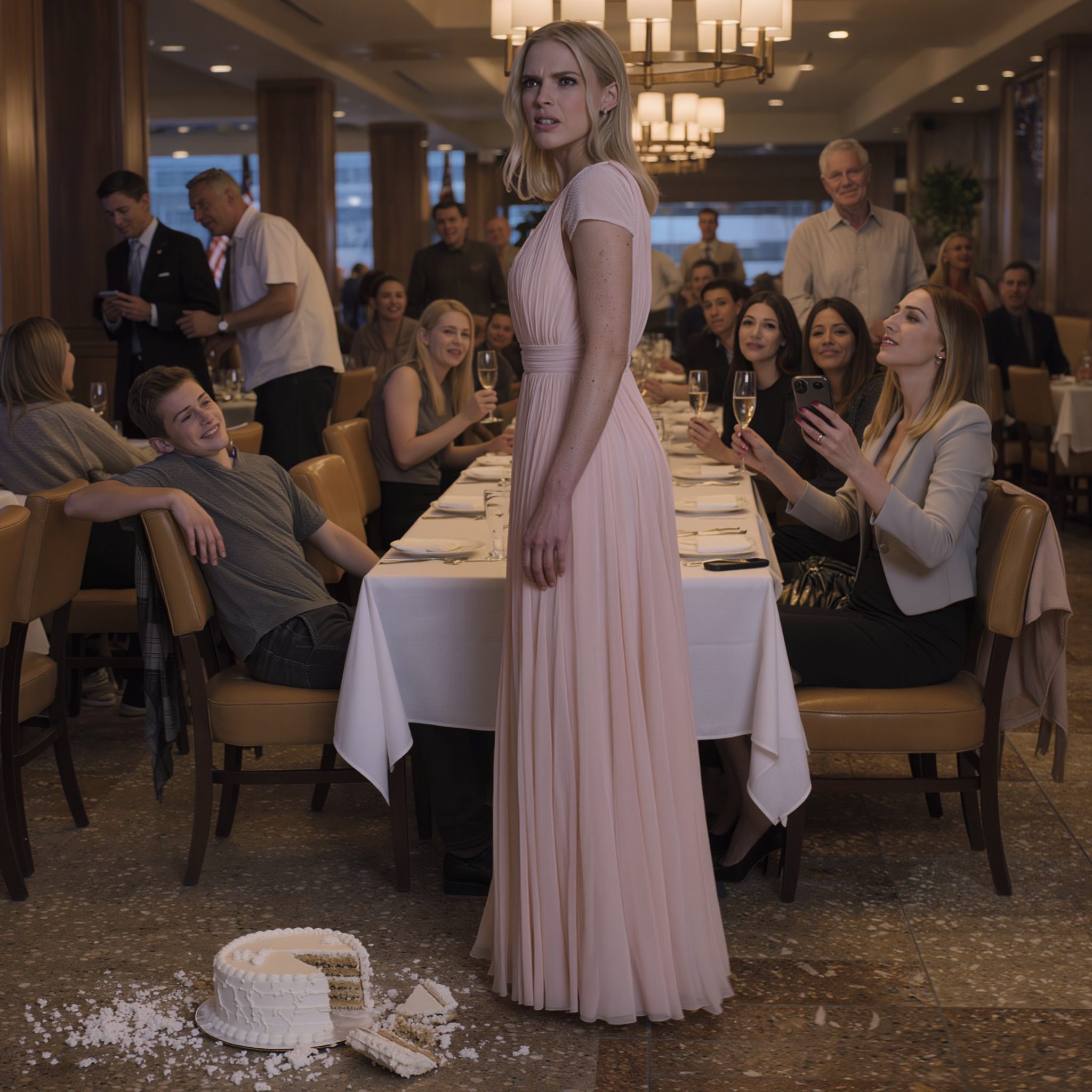 Mijn neefje trapte mijn verlovingscake aan diggelen en schreeuwde: « Ga liggen en eet het van de vloer! » — de hele tafel barstte in lachen uit, mijn zus plaatste het zelfs op haar Instagram-story en gaf een hartje. Die avond appte mijn moeder: « Vanaf nu ben je niet langer mijn kind » — ik antwoordde met slechts één zin… en de volgende ochtend stonden dezelfde mensen die de avond ervoor zo hard hadden gelachen voor mijn deur te bedelen.