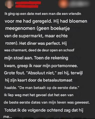 Toen Eric om betaling vroeg voor onze eerste date, dacht ik dat ik een echte aristocraat had ontmoet. Rozen, een lief cadeautje, een interessant gesprek – hij had alles tot in de puntjes verzorgd. Toen hij me de volgende dag een berichtje stuurde, verwachtte ik een prettige reactie, maar toen ik zijn bericht las, zakte de moed me in de schoenen.