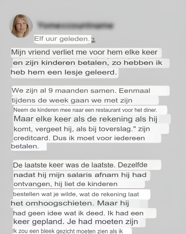 De vrouw maakte zich zorgen over haar handelen, vooral omdat dit gebeurde in het bijzijn van de kinderen van haar partner. Hij beschuldigde haar van egoïsme en beweerde dat ze geen rekening hield met zijn kinderen. Ze vertelde ook dat de kinderen van haar partner graag in restaurants aten, iets wat ze wekelijks samen deden. Echter, telkens wanneer ze uitgingen, « vergat » haar partner zijn portemonnee thuis.