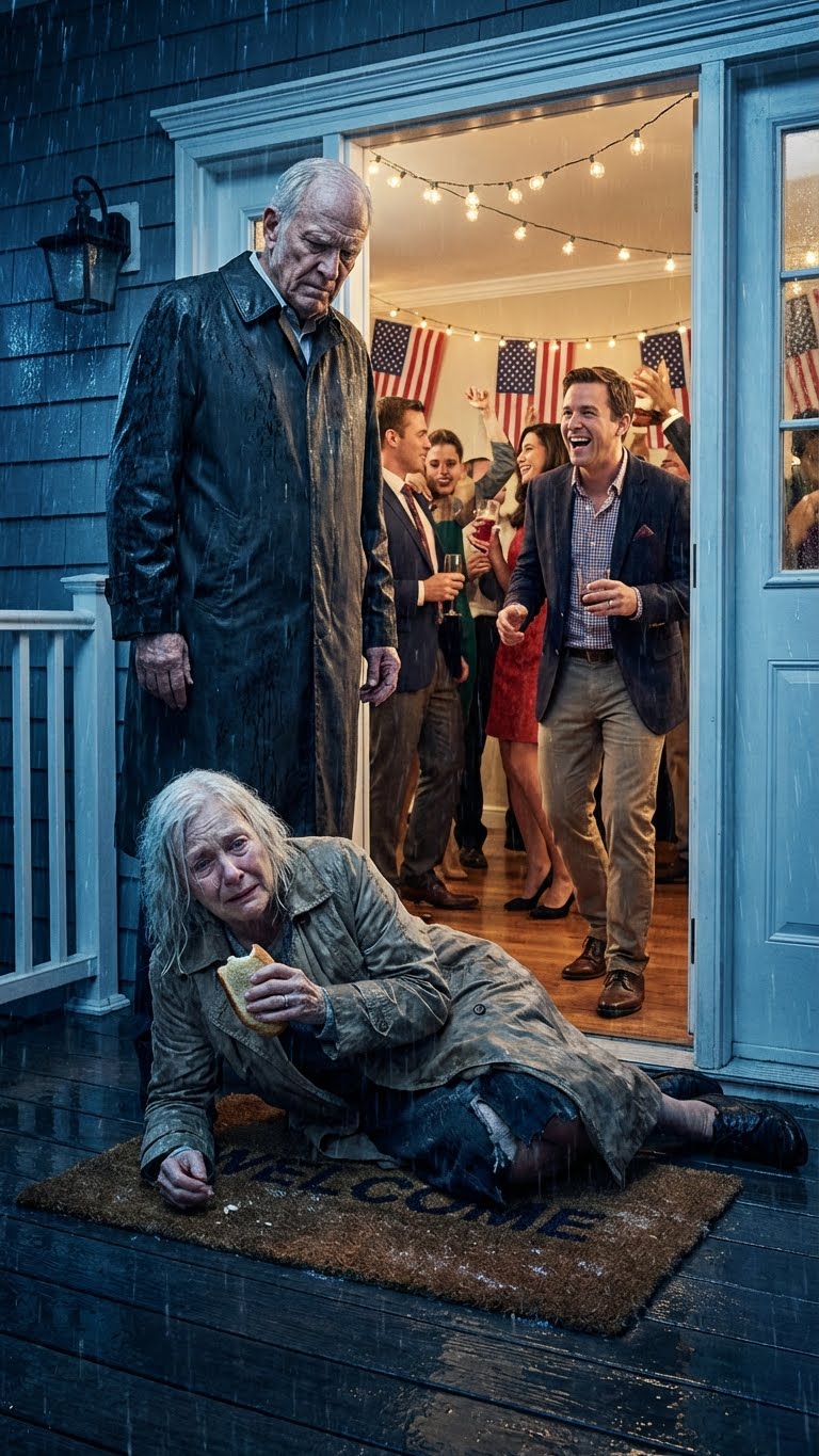 Ik kwam onverwachts thuis en trof mijn vrouw slapend op de deurmat aan, in de ijskoude regen, gekleed in vodden. Mijn schoonzoon veegde zijn modderige designer schoenen af aan haar mouw en lachte, terwijl hij zijn rijke gasten vertelde dat ze gewoon de gekke huishoudster was die graag buiten sliep als een hond. Ik schreeuwde niet. Ik stapte uit de schaduw en het gelach verstomde onmiddellijk, want hij droeg de schoenen van 1200 dollar die ik voor hem had gekocht.
