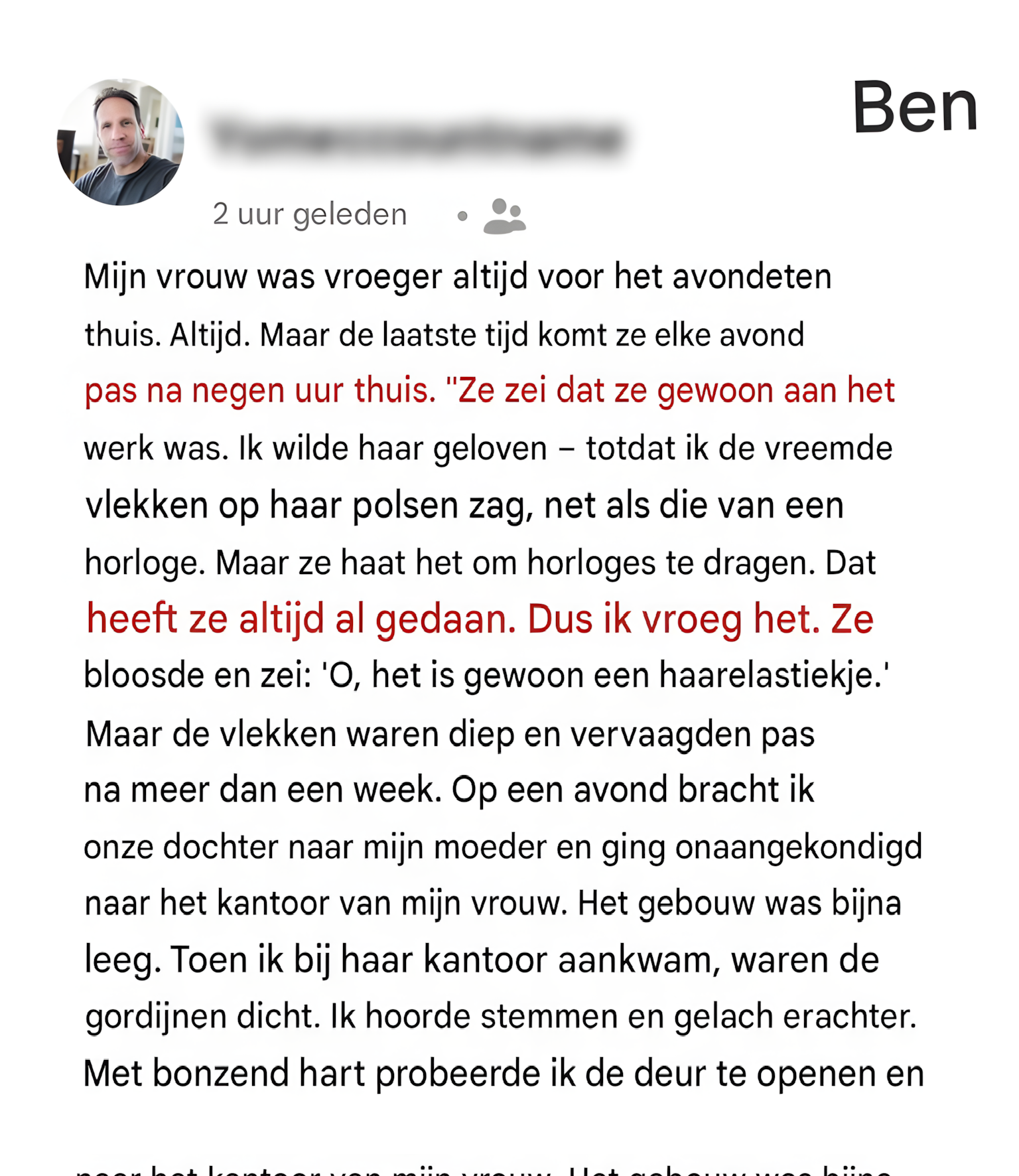 Ik wilde haar geloven. Mijn vrouw gaf me nooit een reden om haar niet te geloven. Toch kon ik het ongemakkelijke gevoel in me niet loslaten. Het moeilijkste?