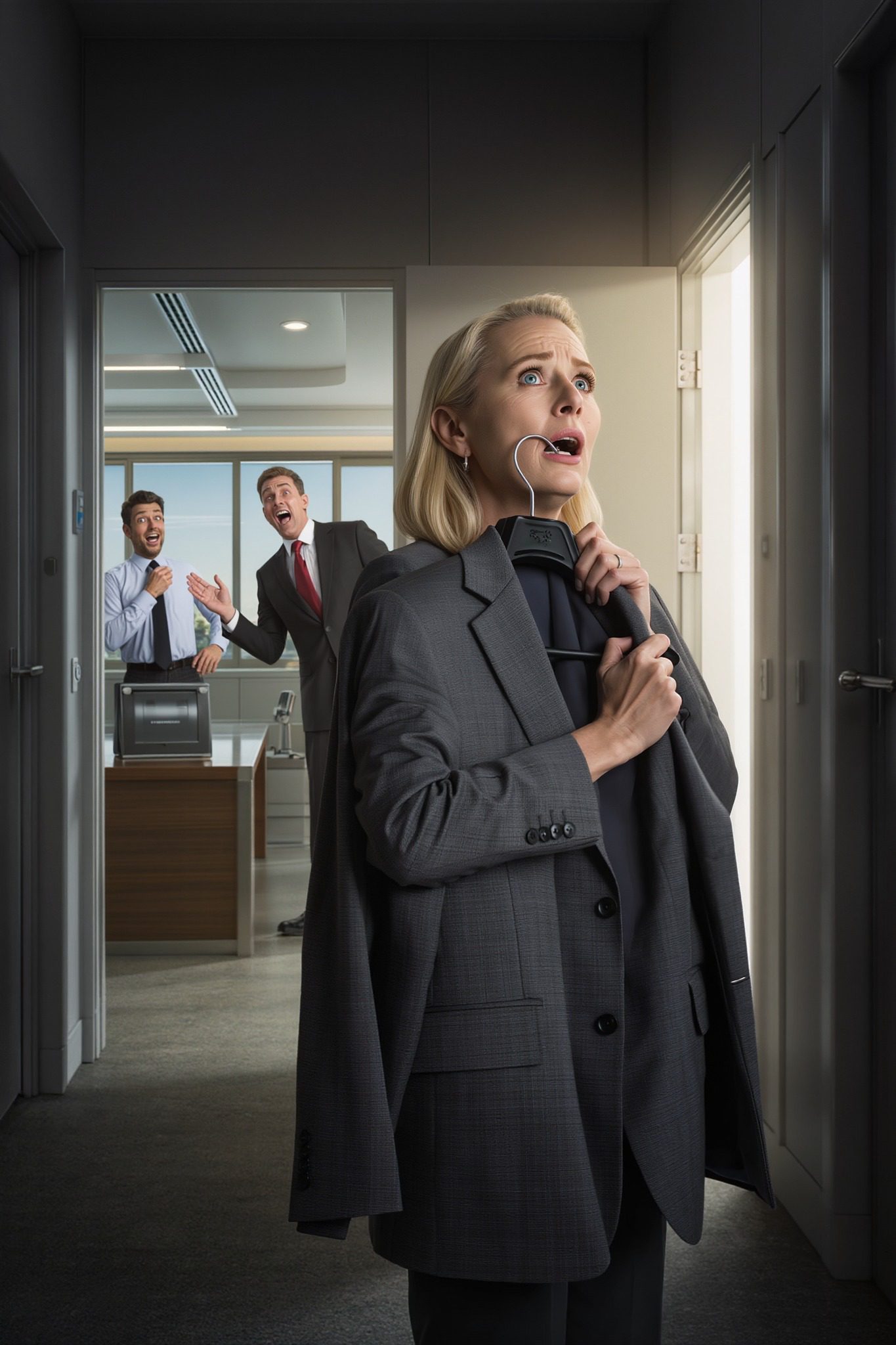 Ik stond daar met zijn keurig gestreken pak over mijn arm, de plastic kledinghoes ritselde toen ik hem stevig vastpakte. De telefoon in zijn thuiskantoor stond op luidspreker, zijn deur stond half open zoals gewoonlijk wanneer hij wilde dat iedereen hoorde hoe belangrijk hij was.