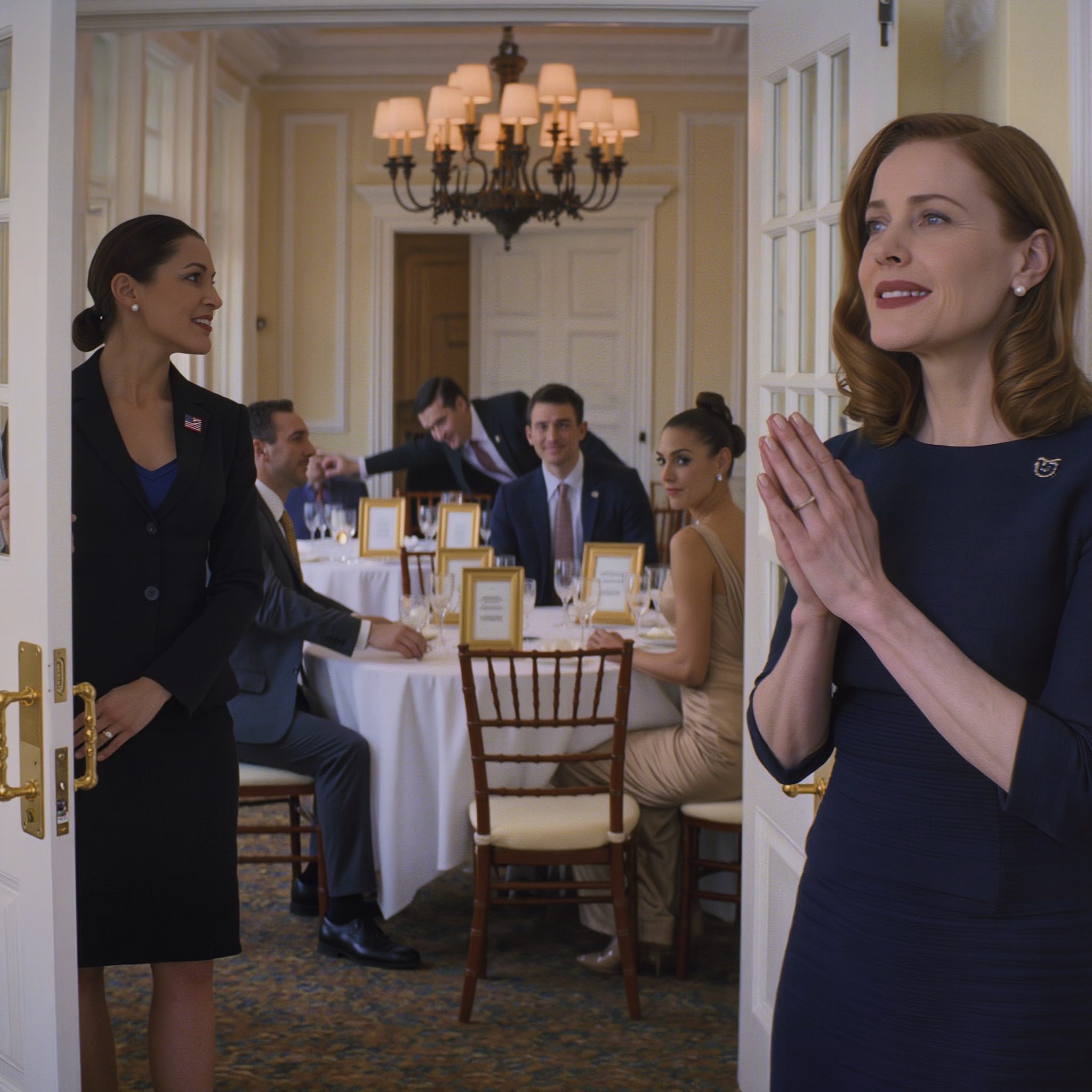 Twee grote ronde tafels, acht stoelen aan elke tafel – in totaal zestien mensen – allemaal zittend, allemaal met een drankje, allemaal pratend en lachend. Bestek op elke stoel. Naamkaartjes in kleine gouden lijstjes. Witte tafelkleden, kristallen glazen, verse bloemstukken als tafeldecoratie.