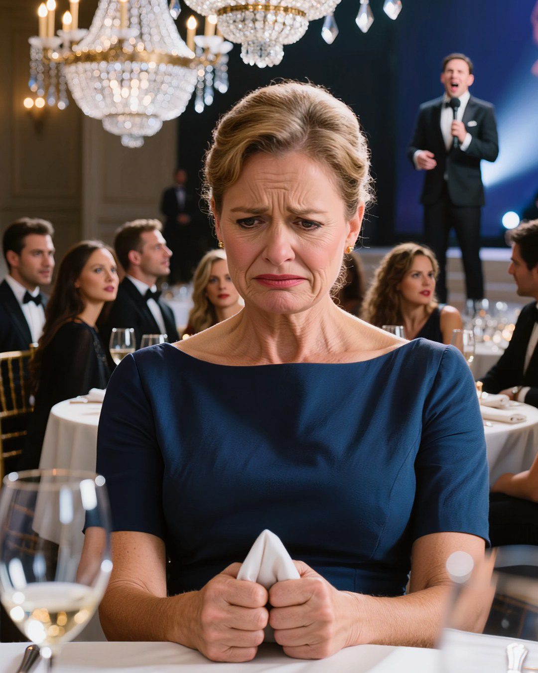 Een halve seconde lang leek de hele balzaal stil te staan. Toen kraakten de stoelen over de vloer toen mensen zich naar het geluid omdraaiden. Gesprekken stokten midden in een zin. Iemands vork gleed uit en klonk tegen het delicate porselein.