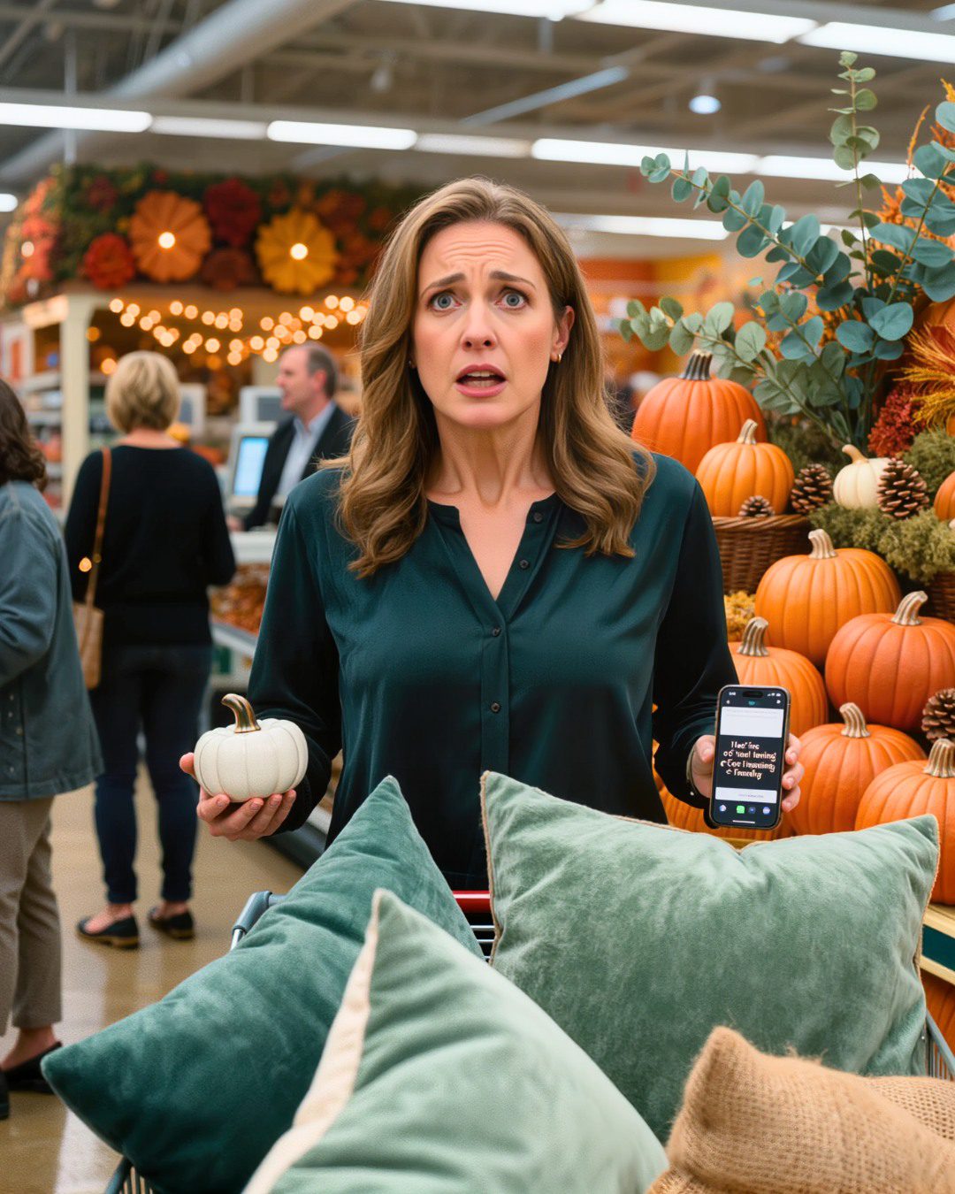 Op de winkelwagen lagen twee saliegroene fluwelen vierkantjes die er luxueus uitzagen in het tl-licht, een jute rechthoek met het woord ‘ gather’ erop gestempeld in een lettertype dat schreeuwde: « Ik organiseer herfstbrunches », en een pompoenvormige keramische schaal waar ik absoluut geen gebruik voor had. Het was dinsdagavond en alles in de winkel rook naar kaneel, dennenappels en in plastic verpakte seizoensoptimisme. Uit de speakers boven mijn hoofd klonk een langzame, vrolijke cover van een nummer dat ik herkende, maar niet kon plaatsen, zo’n nummer dat je hoort als je langs schappen met nep-eucalyptus loopt en denkt: Misschien moet ik mijn leven eens anders gaan aanpakken.