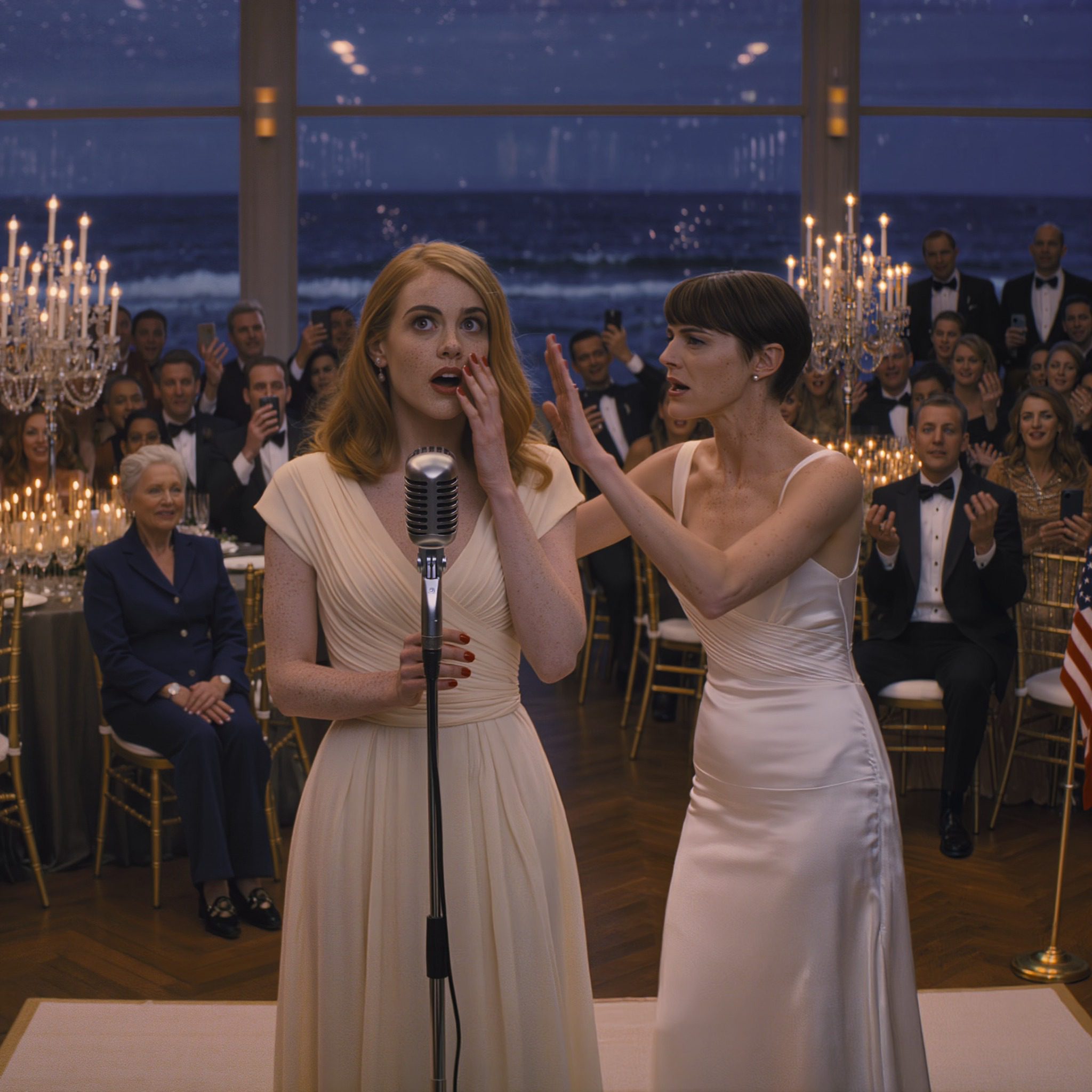 Ik stond nog steeds bij de microfoon toen het gebeurde. Het licht in de balzaal weerkaatste op de kristallen vazen en de zachte gouden gordijnen achter me. De oceaan was op korte loopafstand, zo dichtbij dat ik de golven tegen de golfbreker hoorde kabbelen als de muziek even stilviel.