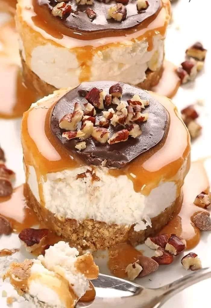 No-Bake Mini Turtle Cheesecakes zijn makkelijke, romige mini-cheesecakes met een laagje kleverige, vochtige karamel, smeltende chocolade en knapperige pecannoten.