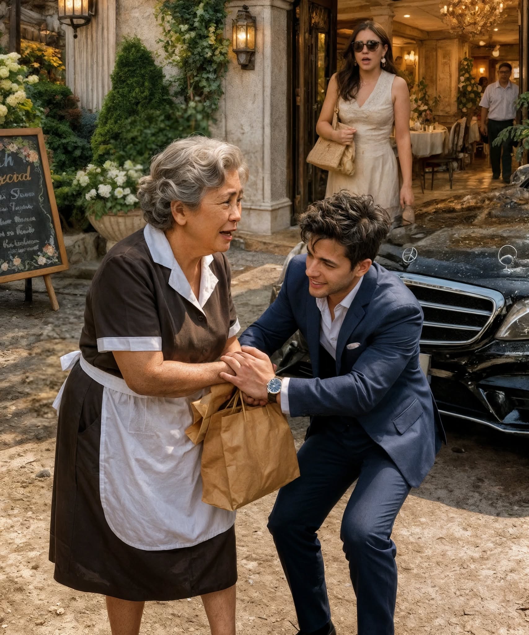 Ze kwamen binnen. Iedereen keek op – obers, personeel, klanten – toen ze hun baas zelf een oude vrijster zagen ondersteunen.