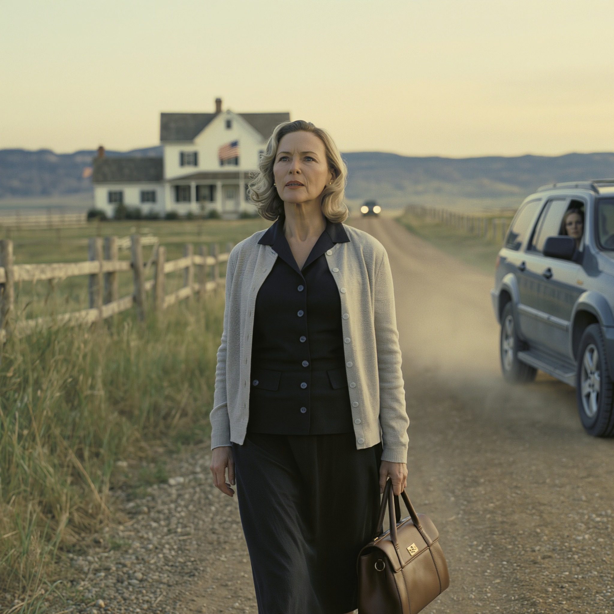 Het stof dwarrelde op als een dunne sluier over de tweebaansweg, het soort stof dat je proeft – droog, bitter, hardnekkig. Een gehuurde SUV stond stationair te draaien tegen de rand van de weilanden in Oregon, koeien draaiden langzaam hun koppen om alsof ze wisten hoe wreedheid er in het daglicht uitzag. Ik stond in het grind met een kleine koffer en een handtas die plotseling zwaarder aanvoelde dan mijn botten. De deur klikte dicht. Banden sisten. Mijn dochter keek niet om.