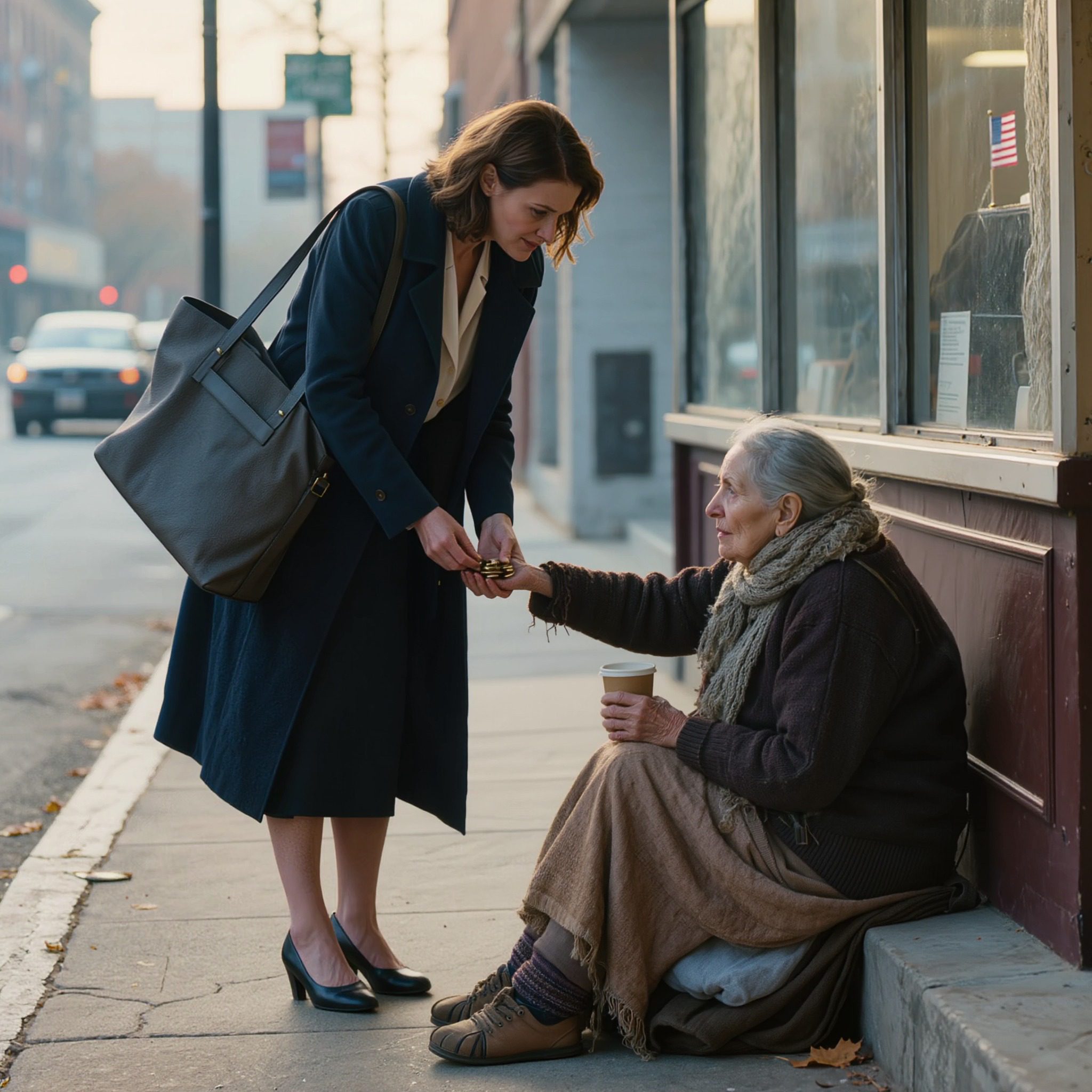 Ik had haar al op de eerste dag van haar nieuwe baan opgemerkt. Ze bedelde nooit luid, zeurde nooit en stak nooit met trillende hand haar hand uit naar voorbijgangers. Ze zat gewoon op een platgedrukt stuk karton in een verbleekte jas, met een klein blikken bekertje voor zich. Naast het bekertje leunde een scheef kartonnen bordje met wankele blokletters.