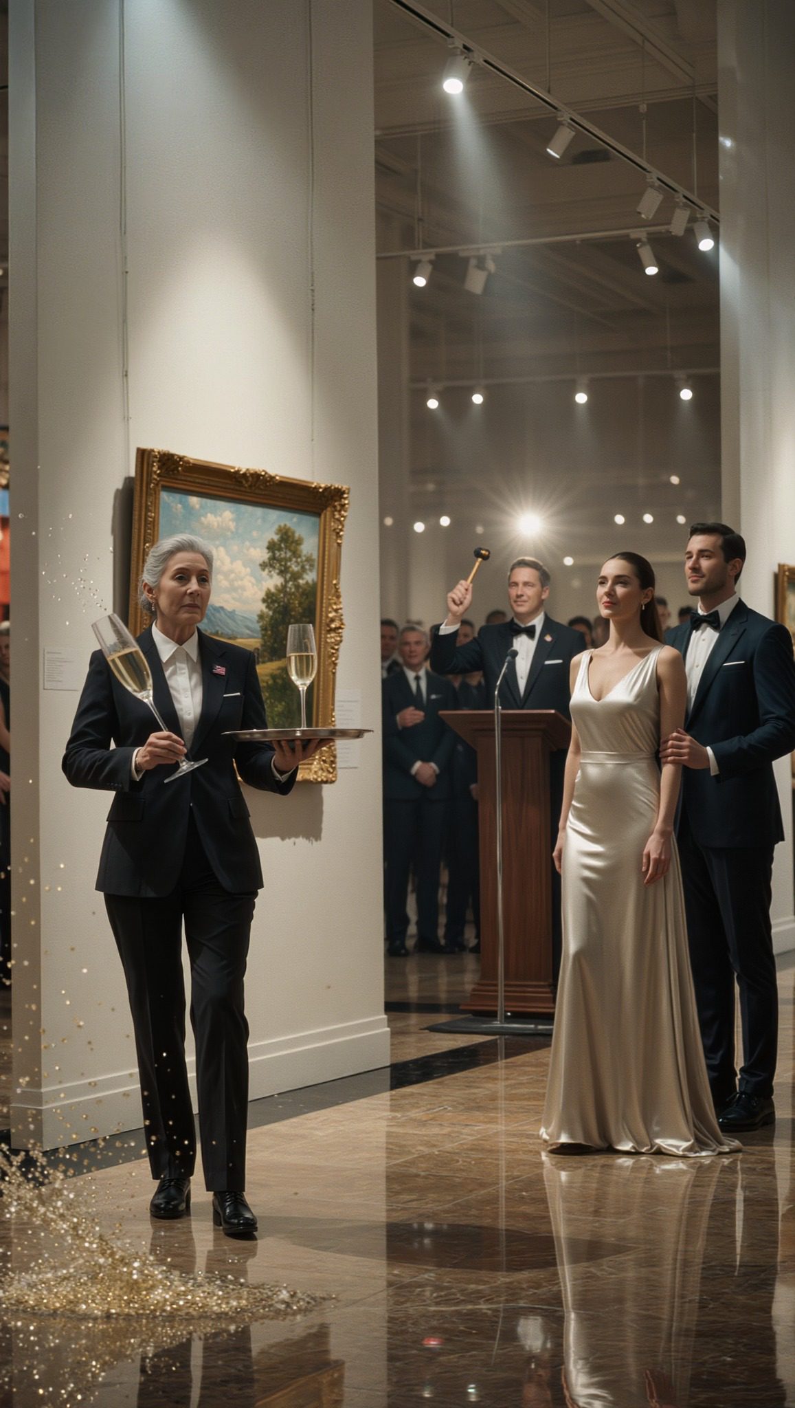 Na jarenlang als kunstenaar te hebben geworsteld, nam ik een baan aan als champagneschenker in een chique galerie. Tijdens een veiling verstijfde ik van schrik.